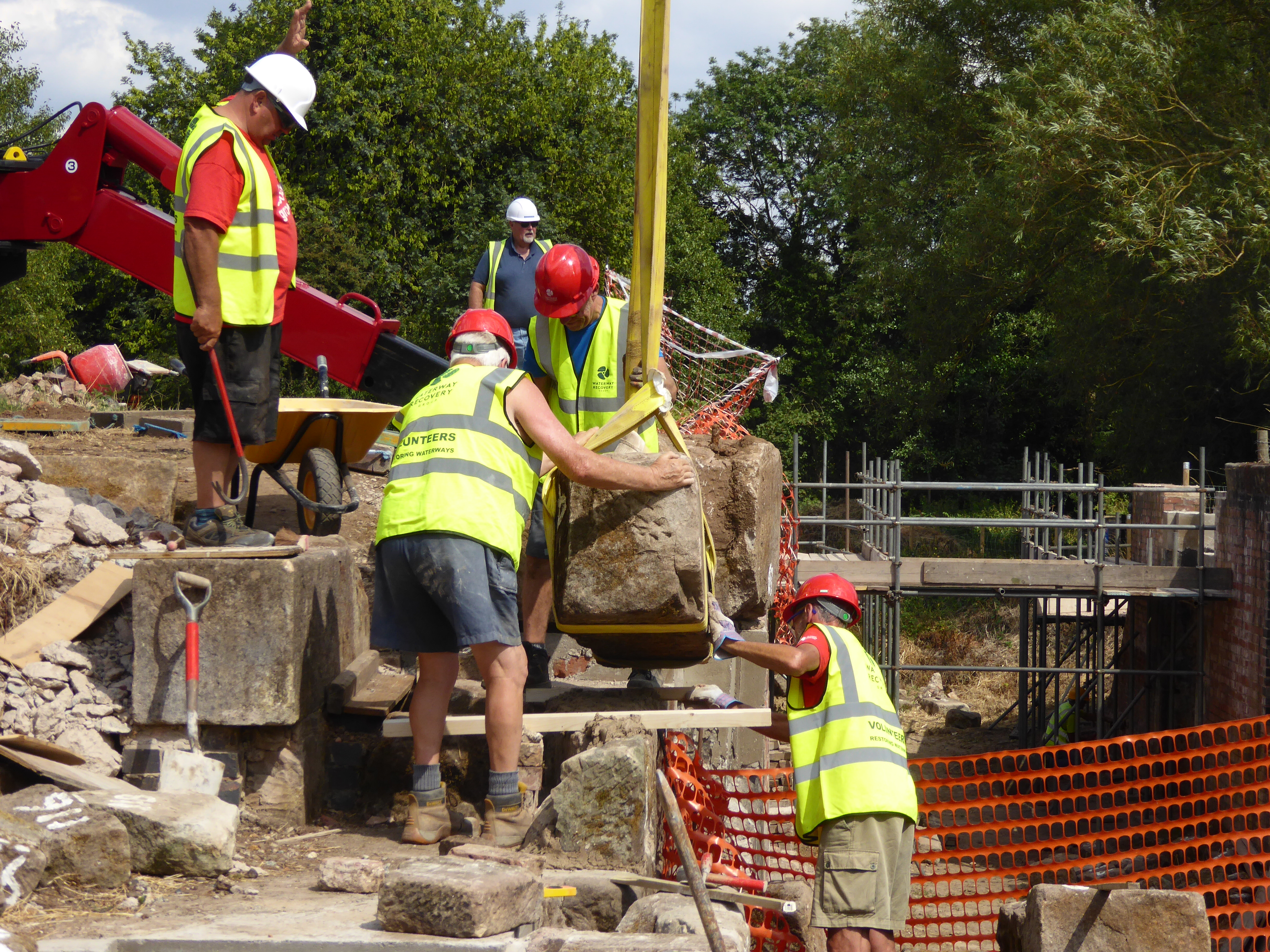 Waterways Recovery Group arrived on Saturday 21st July and started work in earnest at Borrowash on the Sunday morning. Great progress has already been made by the team of some 19 volunteers. A mobile spider crane arrived on Monday to lift large stone blocks, some weighing up to 2.5 ton. Over the week we anticipate that all the large stones that were previously displaced will be returned to their rightful place.