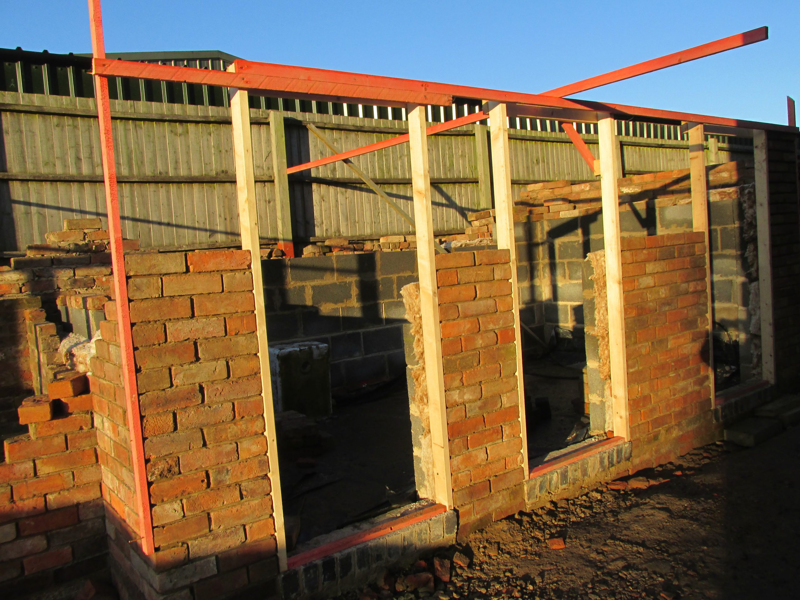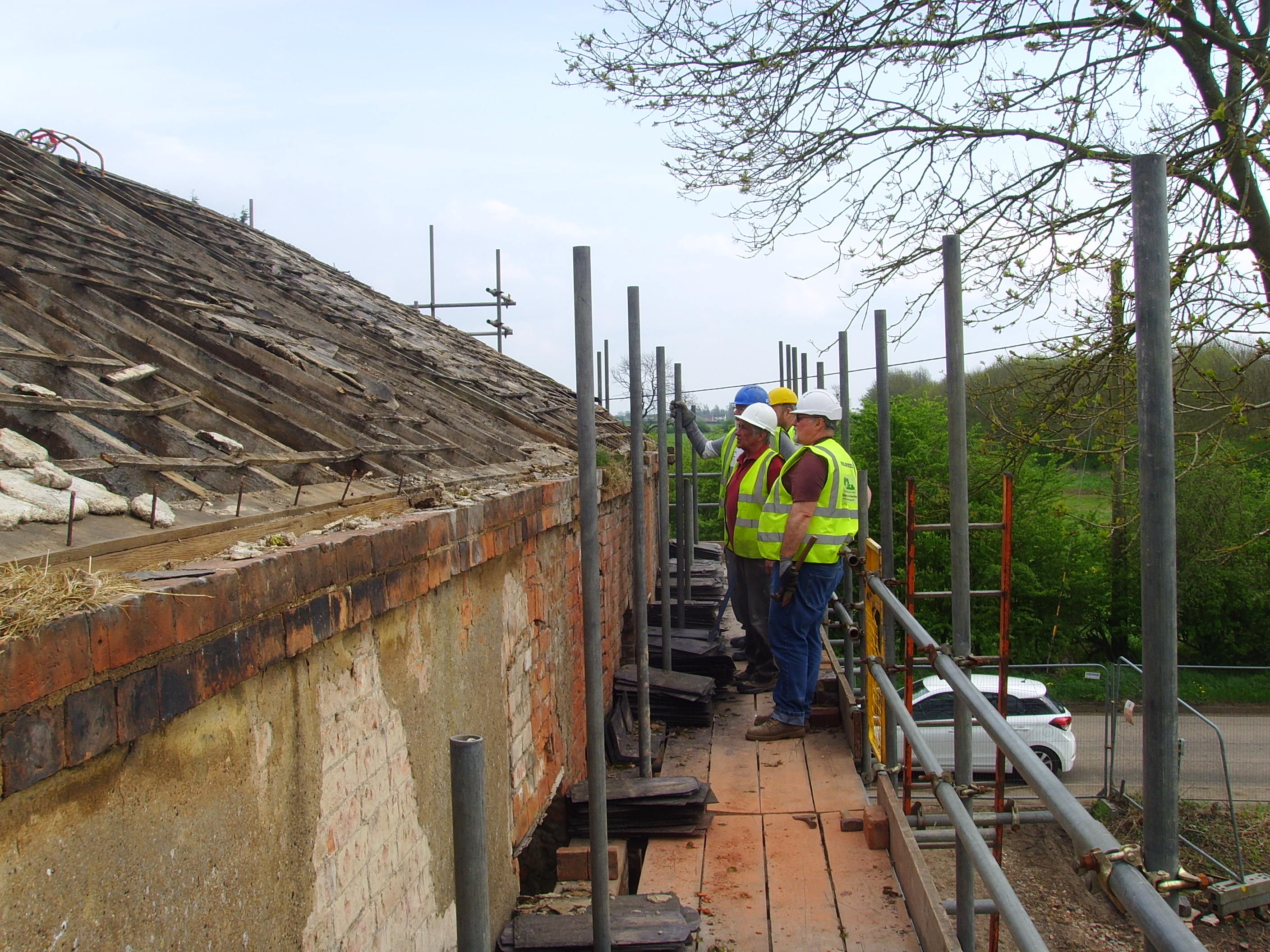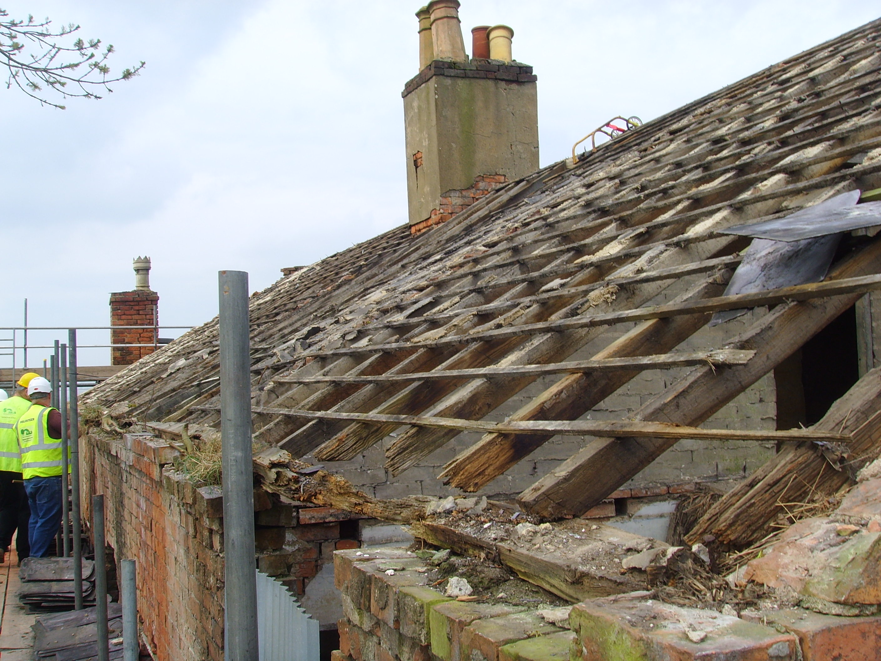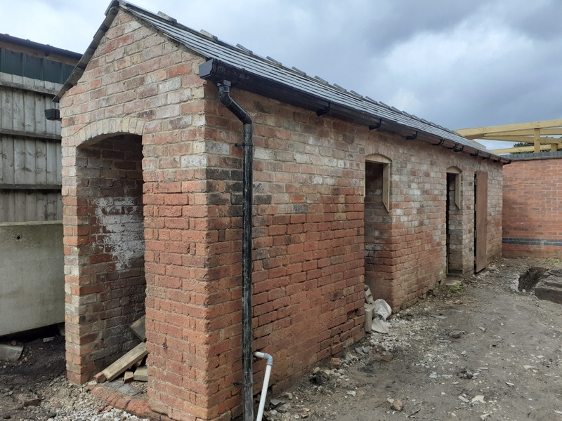 - Scaffolding was erected around the entire building, to enable a heritage-specialist builder to rebuild the main structure. All the work was done using reclaimed bricks from the main building and the dilapidated outbuildings. The majority of the internal walls were left untouched.