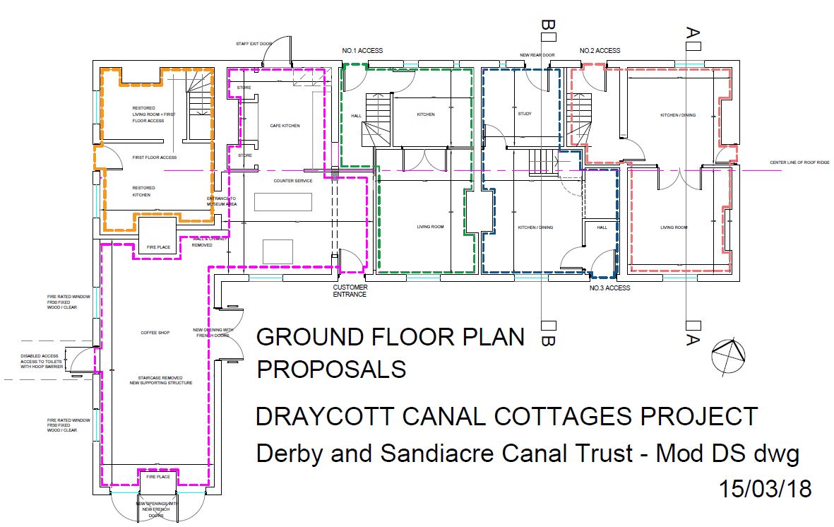 Plans were drawn up to restore the building to create a mixed residential and commercial complex (see the plan to the right of the page). The residential side comprises of three cottages – with two, three and four bedrooms – with accommodation spread over three floors in all three cottages. The ground floor of the commercial section is a café with kitchen, reception and seating areas; the upstairs is being used as offices/meeting rooms. A downstairs room has been turned into a museum for the Trust to display pictures and artefacts. The museum room, and one of the offices, are now used to provide a base for the Trust to showcase the heritage of the cottages and the wider Derby Canal. It is hoped that in the long term, the site will form a base for activities and canal line services, e.g., shower, changing room, café.