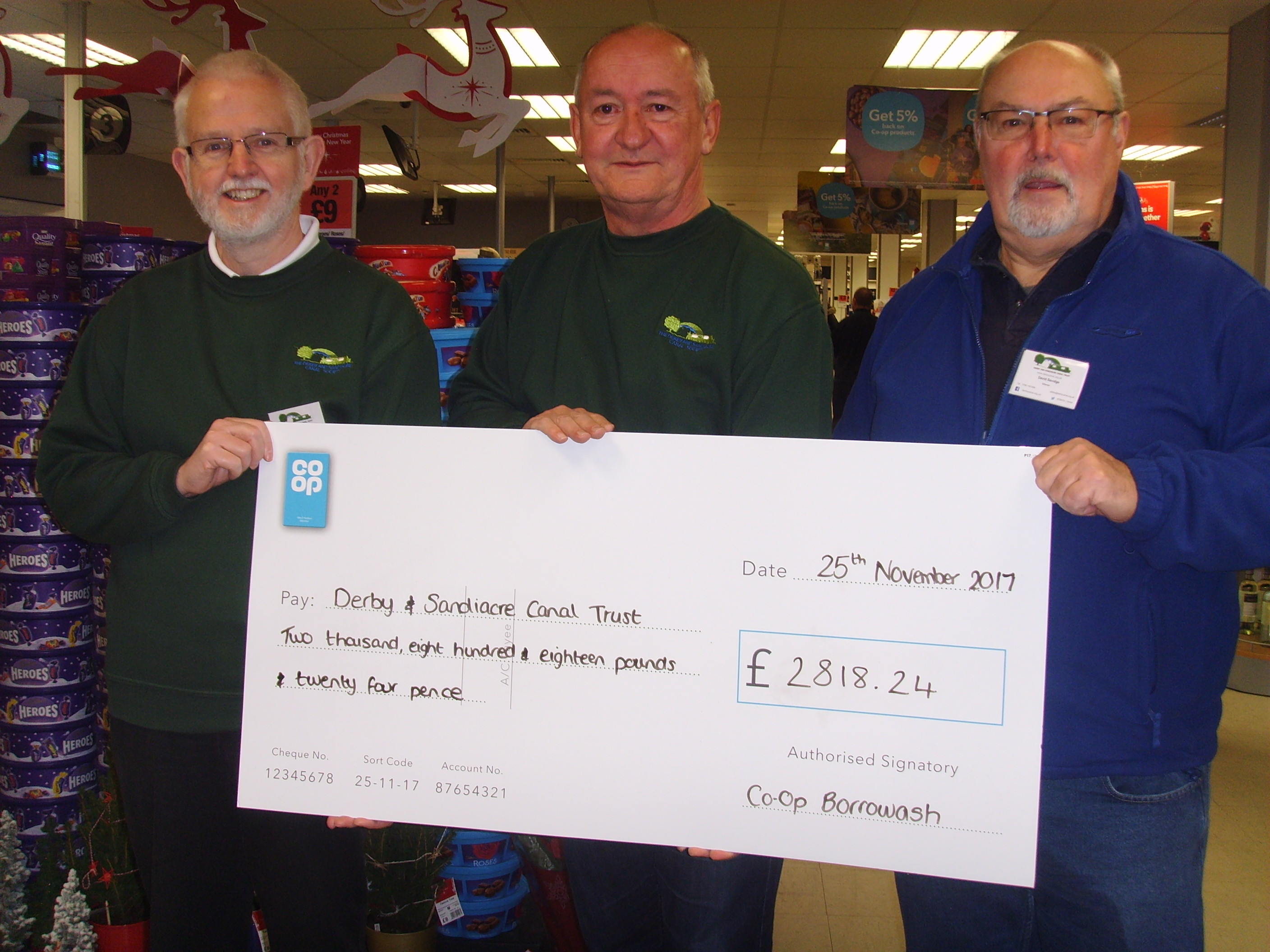 Following the latest round of Co-Op Local Community funding, the Derby and Sandiacre Canal Trust is pleased to announce that it has received £2818.24 from the Borrowash Store as one of three supported charities.