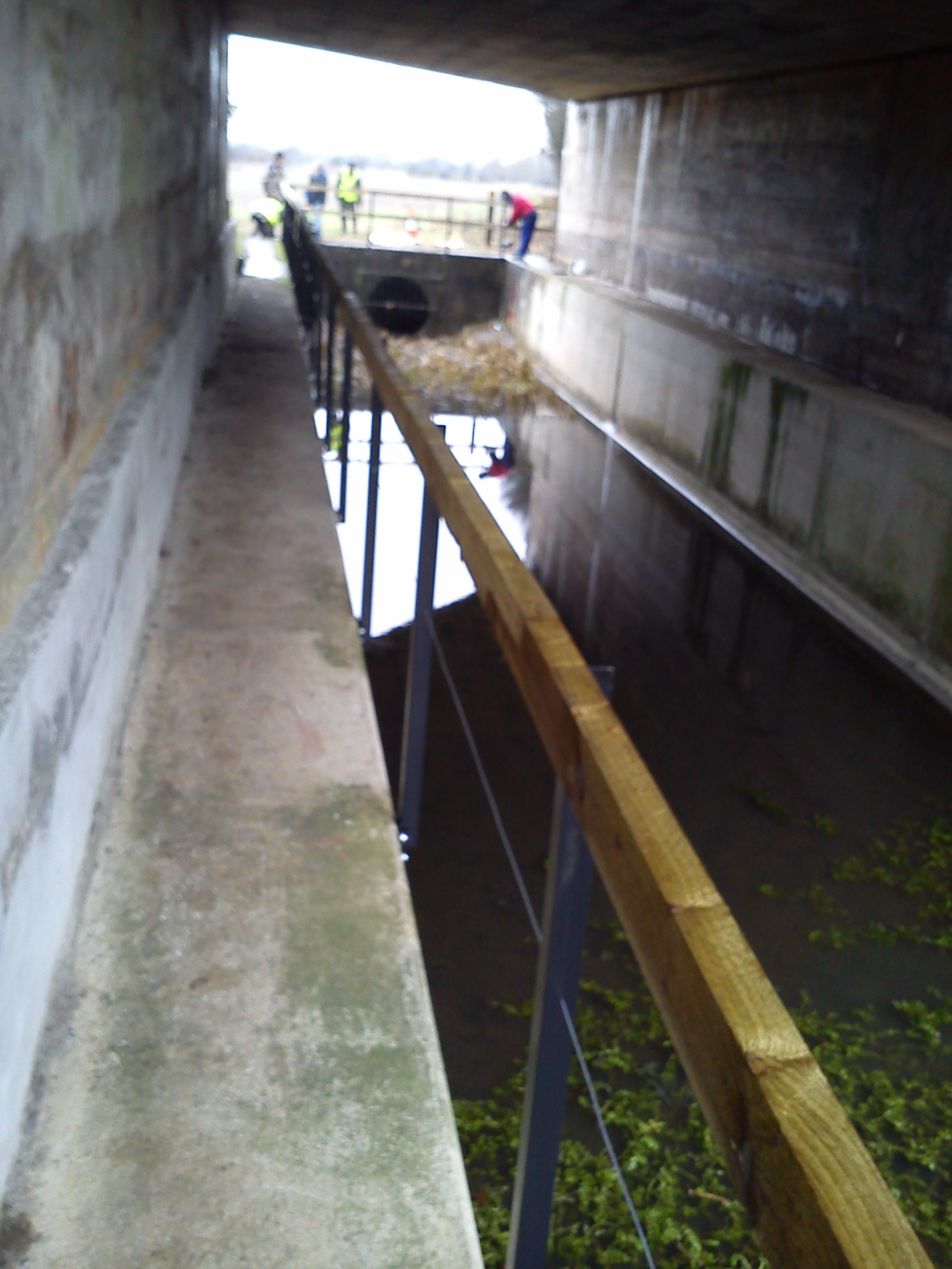 In early January we were advised that the safety fence at the edge of the narrow walkway under Draycott Road Bridge had been stolen and Derbyshire County Council had placed a closure notice on the footpath. The photos below show the original fence and then the walkway with the fence removed; with careful examination of the picture you can see the bolts protruding from the concrete where the fence had been carefully removed.