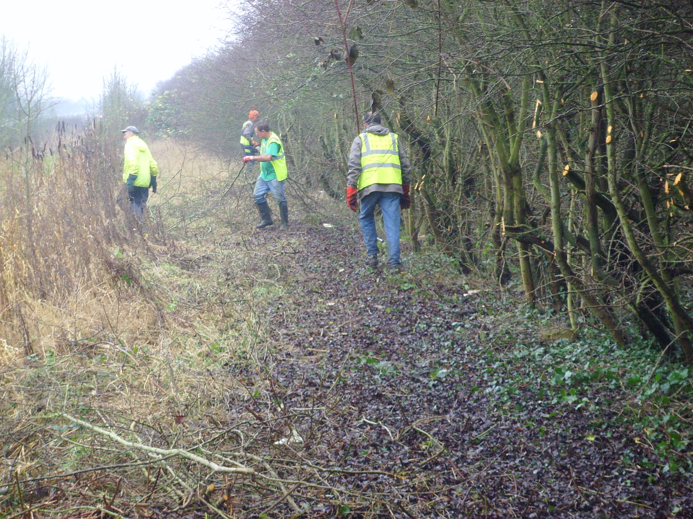 Picture shows some of the team clearing bramble from one side of the hedge.