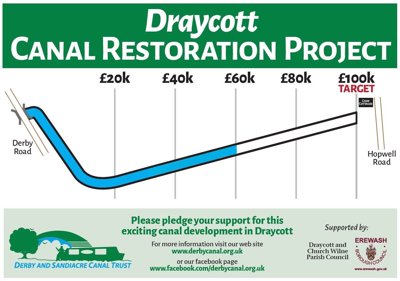 The Derby & Sandiacre Canal Trust is pleased to announce that the Draycott Canal Restoration Project, affectionately referred to as “The Golden Mile”, has now surpassed the £60,000 threshold towards the target of £100,000 worth of pledges; which will then allow match-funding to be sought to provide the full amount for the restoration.