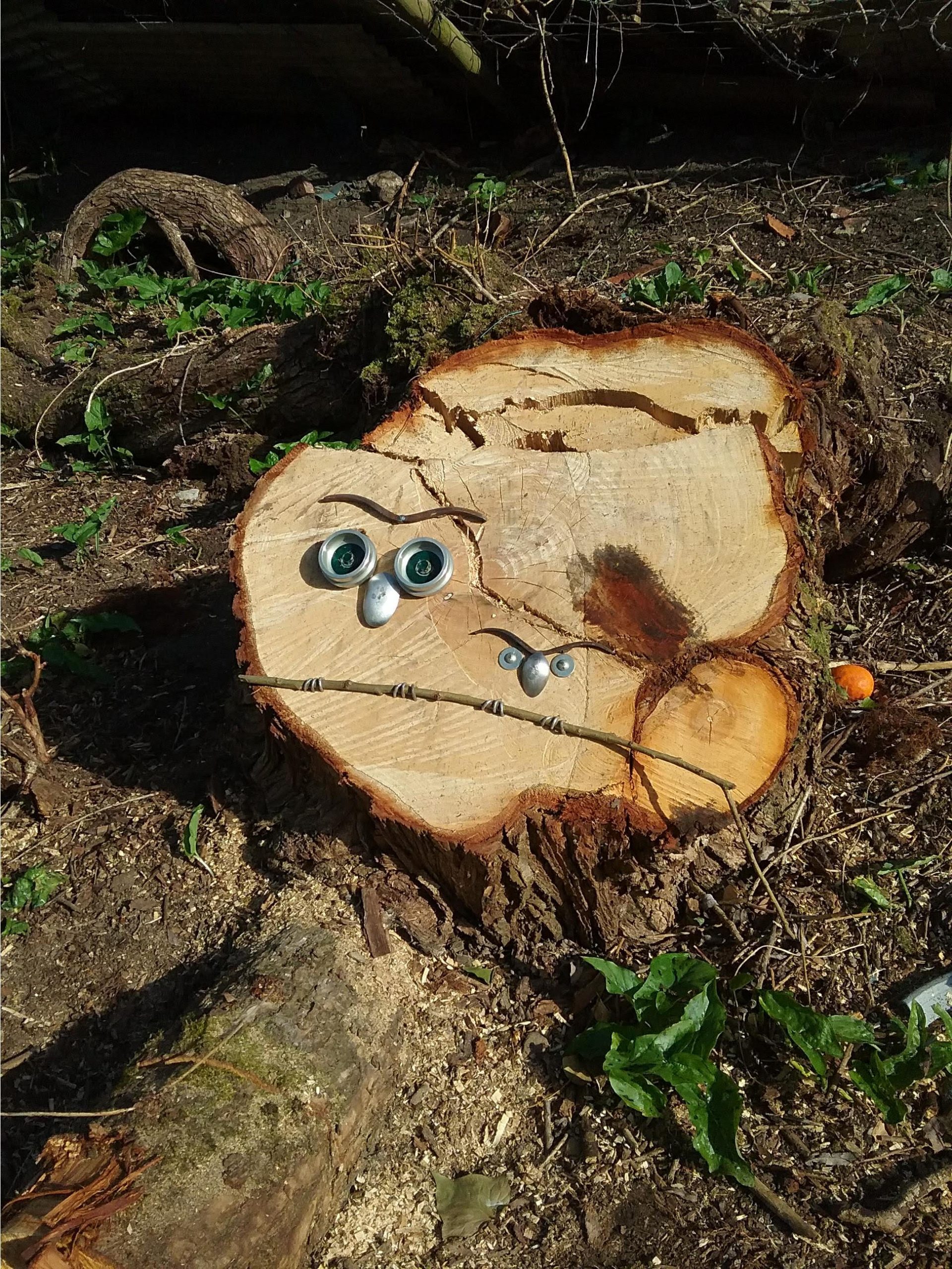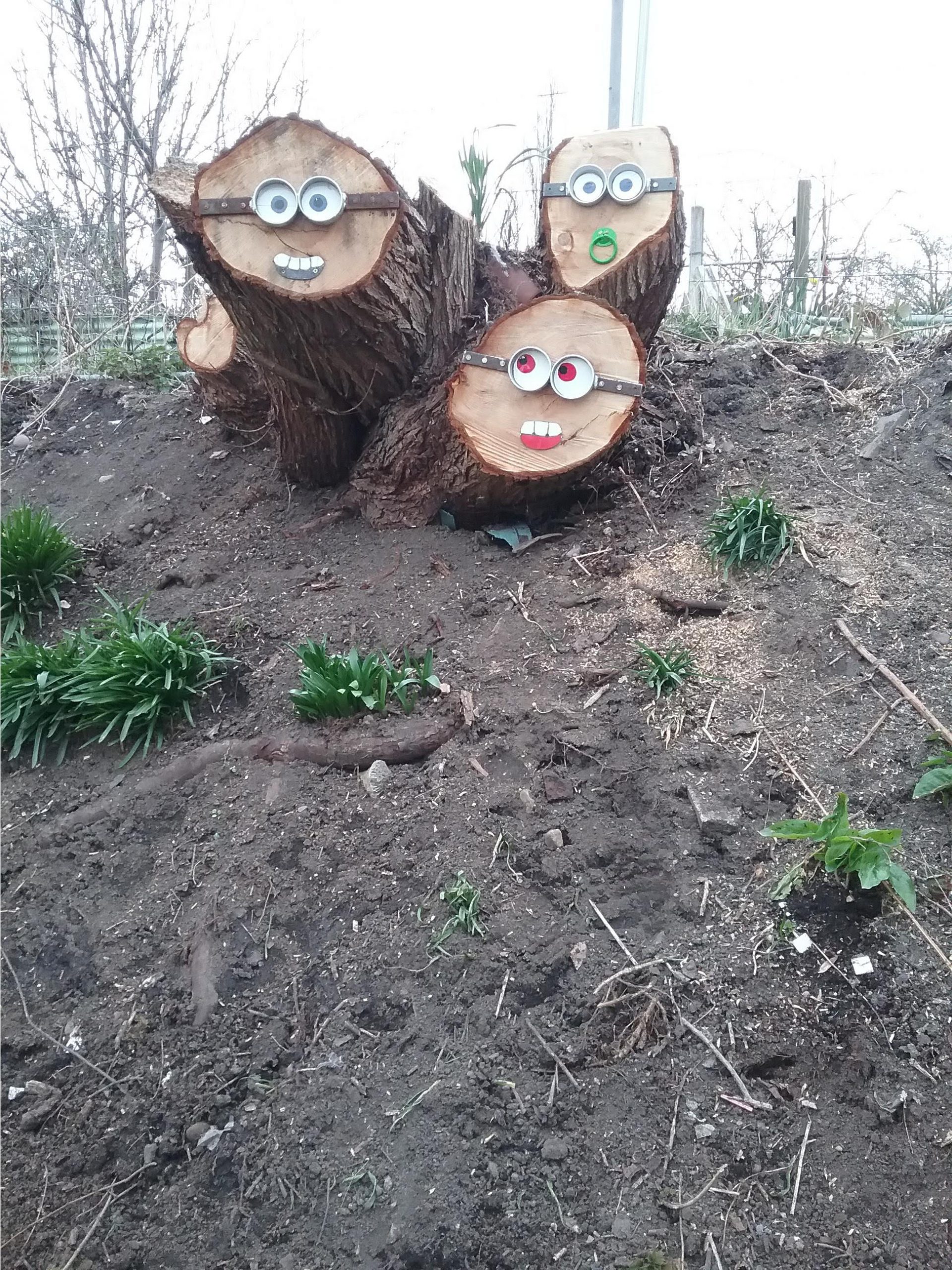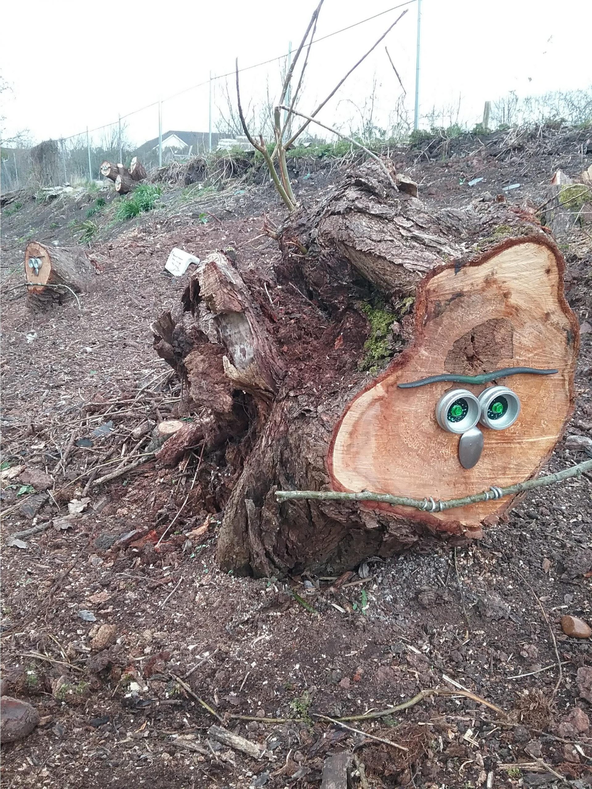 After a few weeks of cutting, digging, winching etc the area looks safer and clearer with many logs stacked for free collection and many loads delivered for free in a Socially Distanced manner. We noticed that all the cut trees, because of their lean angle were cut vertically and sort of presented themselves well for a bit of artwork hence the goggle faces, the four Owls and now a squirrel.