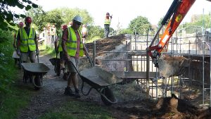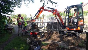 Despite searing heat our friends make good progress at Borrowash Bottom Lock, pictures depict the movement of infill from below the lock chamber to behind the freshly built up wing walls.